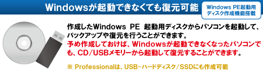 ・Windows PE 起動用ディスクをUSB外付けハードディスクに作成するには、空の(未割り当て)のハードディスクが必要です(Professional版のみ)。