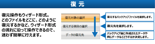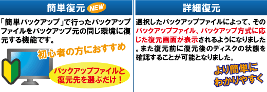 ◆「簡単復元」の追加。(「簡単バックアップ」で行ったバックアップファイルをバックアップ元と同じ環境に復元する機能)