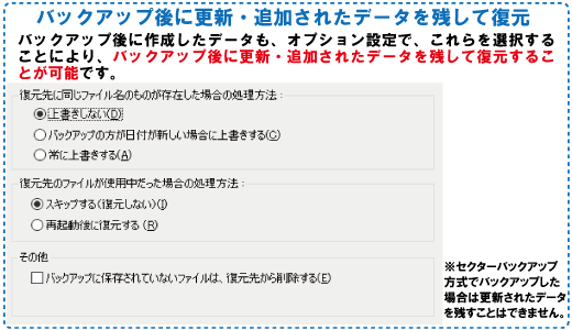 バックアップ後に更新・追加されたデータを残して復元ファイルバックアップ方式でのバックアップでは、復元時に同名のファイルが存在する場合、その処理方法を選択します。 Windowsが起動できなくても復元できる