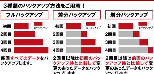 フル/差分/増分バックアップについてフルバックアップ 差分バックアップ 増分バックアップ |