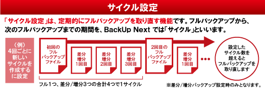 サイクル設定指定した回数ごとにフルバックアップを取り直すサイクル設定が可能です。 |