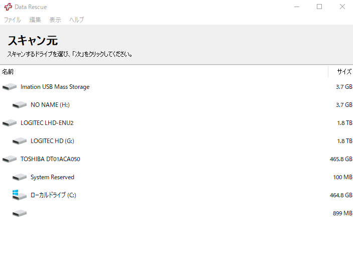 またドライブが表示されない場合はData Rescueでは復旧できませんので、修理をするかデータ復旧サービス会社へご相談されることをおすすめします。