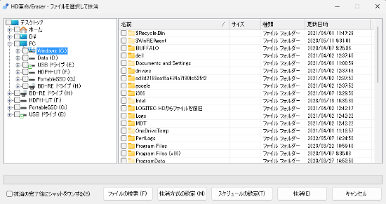 「ファイルを選択して抹消」では、抹消したいファイル・フォルダーを選択して抹消することができます。