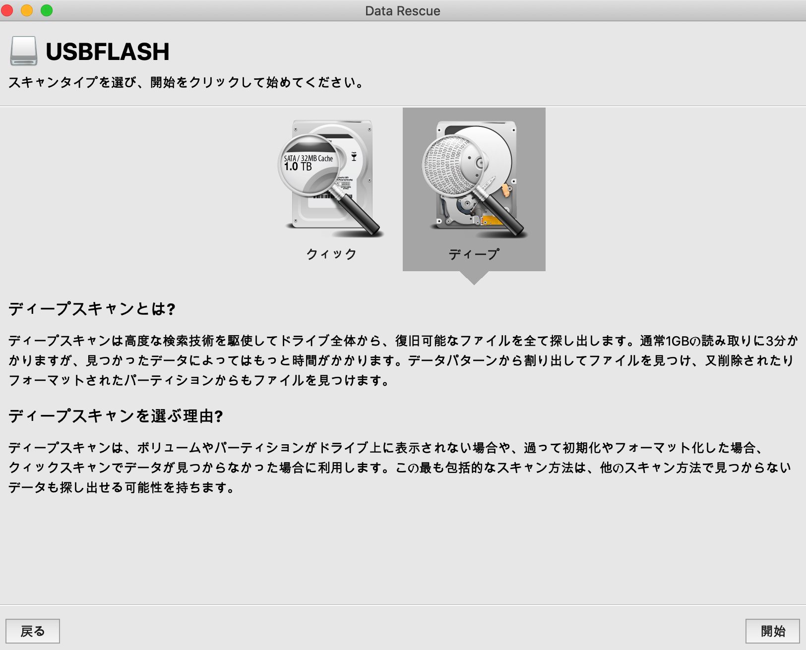 デバイスのクイックスキャンまたはディープスキャンのいずれかを選択します。いずれかのスキャンタイプをクリックしてその用途の詳細を確認し、スキャンを開始する準備ができたら[開始]をクリックします。