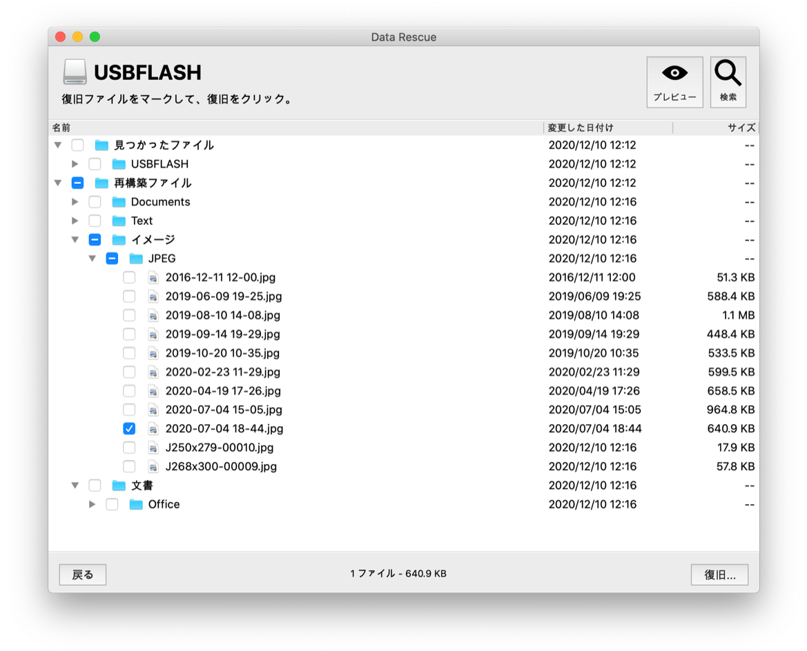 ファイルやフォルダを復旧対象としてマークしたら、右下の[復旧]ボタンを押します。その後、復旧したファイルの保存先を選択するよう求められます。これは、スキャンしたデバイス以外の場所で、空き領域が追加されている場合は、一時記憶領域の保存場所を含め、任意の場所にすることができます。
