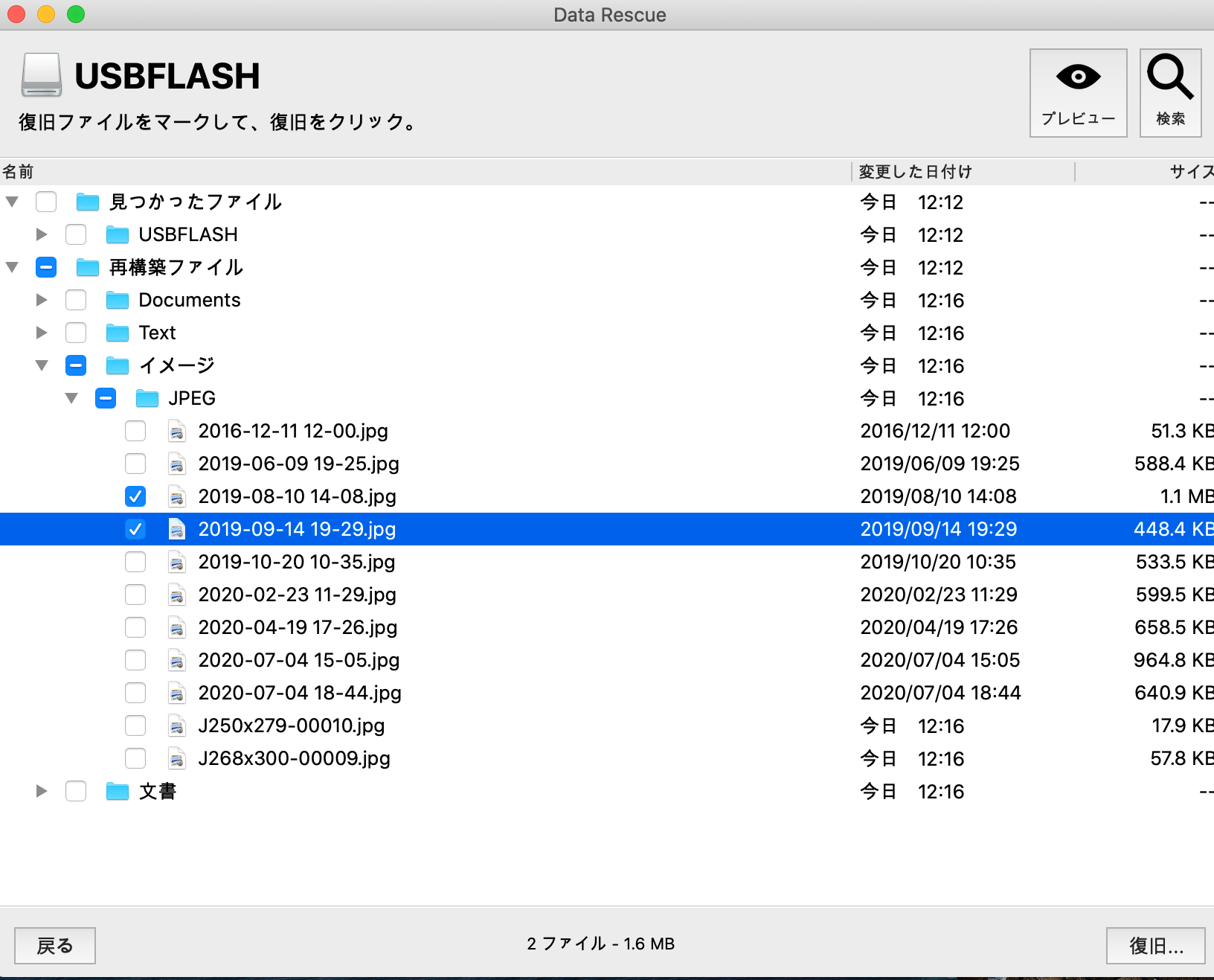 ファイルとフォルダを復旧対象としてマークしたら、右下の[復旧]ボタンを押します。その後、復旧したファイルの保存先を選択するよう求められます。これは、スキャンしたデバイス以外の場所を選択します。
