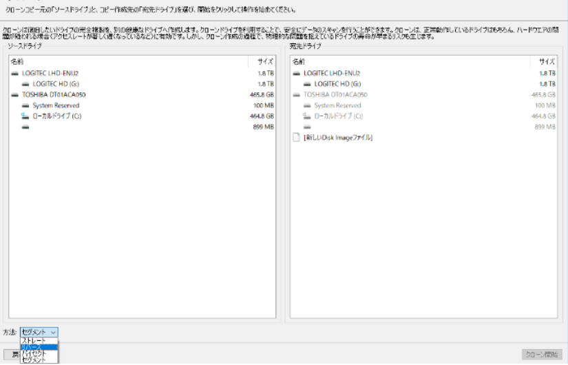 ※クローンのコピー先ドライブ上のデータはすべて、ソース ドライブのデータで上書きされます。クローンのデスティネーション(行き先)をバックアップしたか、データ損失を防ぐためのデスティネーション(行き先)として空のドライブを使用していることを確認します。