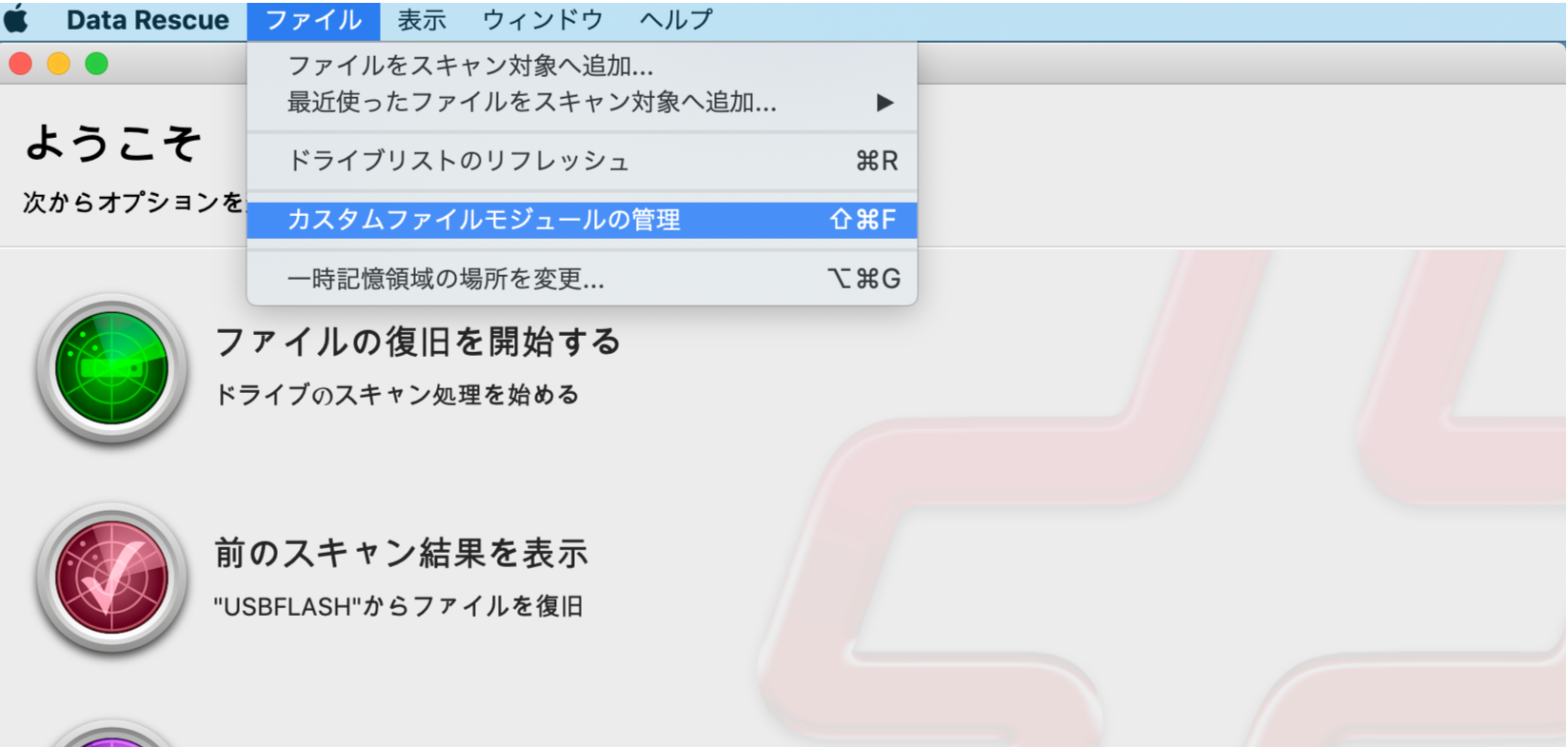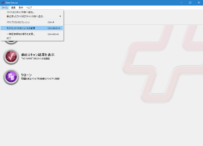 データレスキューを開き、ファイル→カスタムファイルモジュールの管理のドロップダウンメニューオプションに移動します。
