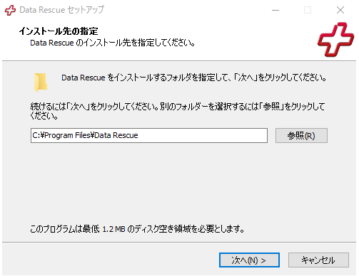 Data Rescueのインストール先を確認するウィンドウが開きます。既定では、コンピュータのプログラム ファイルにインストールされます。新しい場所を選択するか、デフォルトのままにして、[次へ] をクリックします。デスクトップショートカットを作成するかどうか尋ねられますが、デフォルトでショートカットが作成されます。インストールを実行するには、[次へ] をクリックしてください。