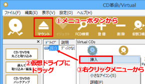 メイン画面で「Ctrl」+「Shift」+「仮想CDが挿入されているドライブ文字」の3つのキーを同時に押すことで挿入されている仮想CDを入れ替えることができます。